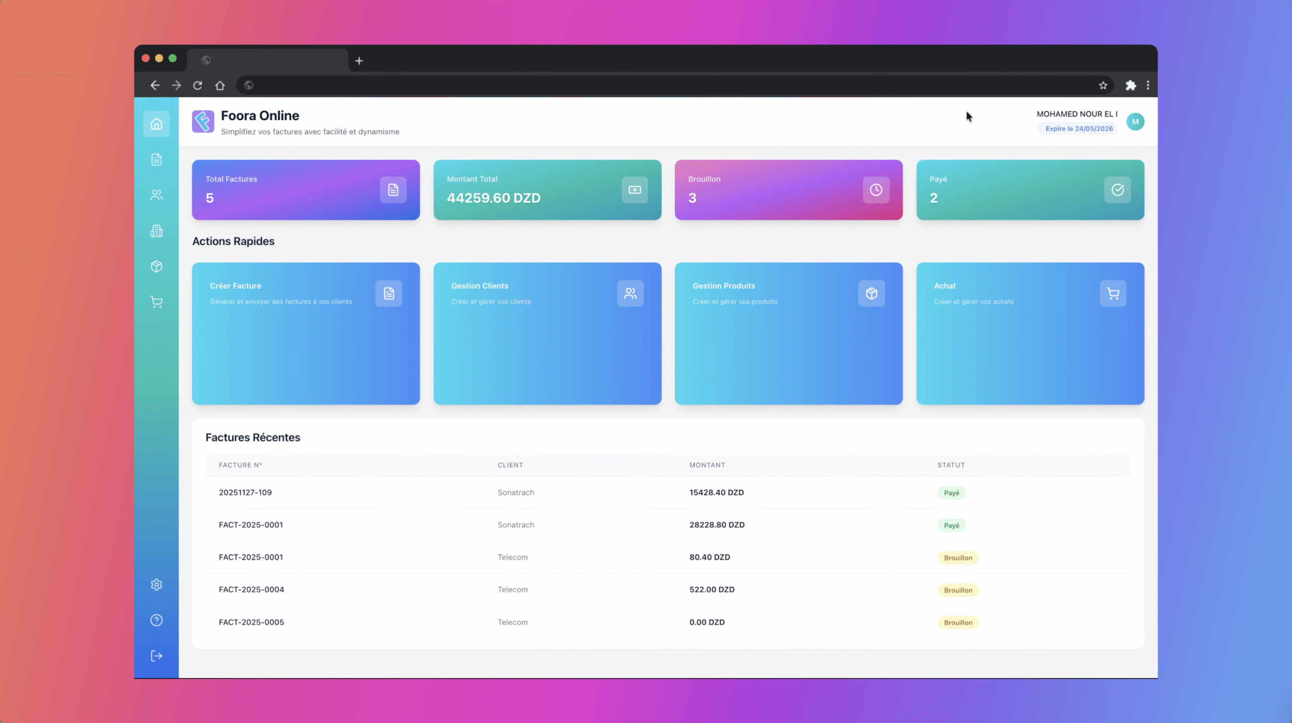 Foora Online est la solution complète pour la gestion de vos factures, clients, produits et ventes. Tout ce dont vous avez besoin pour développer votre business.